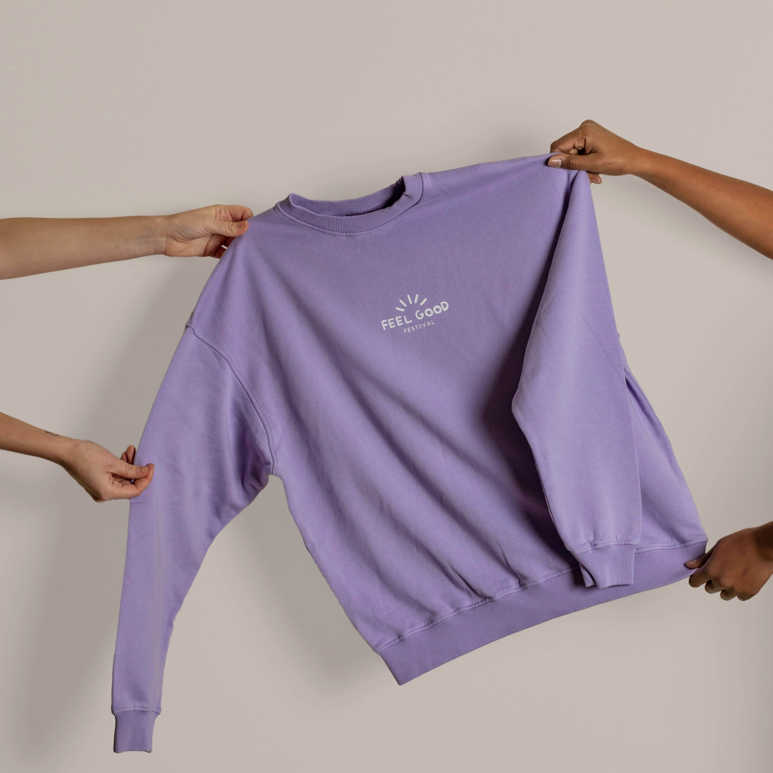 Oversized Sweater aus 100% Bio-Baumwolle mit „Find your Feel Good“-Aufdruck auf der Rückseite.